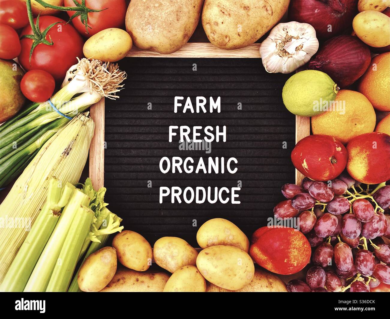 Farm Fresh Organic Produce Sign Against A Rustic Background Of Fresh Fruit And Vegetables Farmers Market Ingredients Locally Sourced Organic And Healthy Veggies Stock Photo Alamy